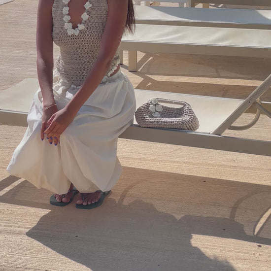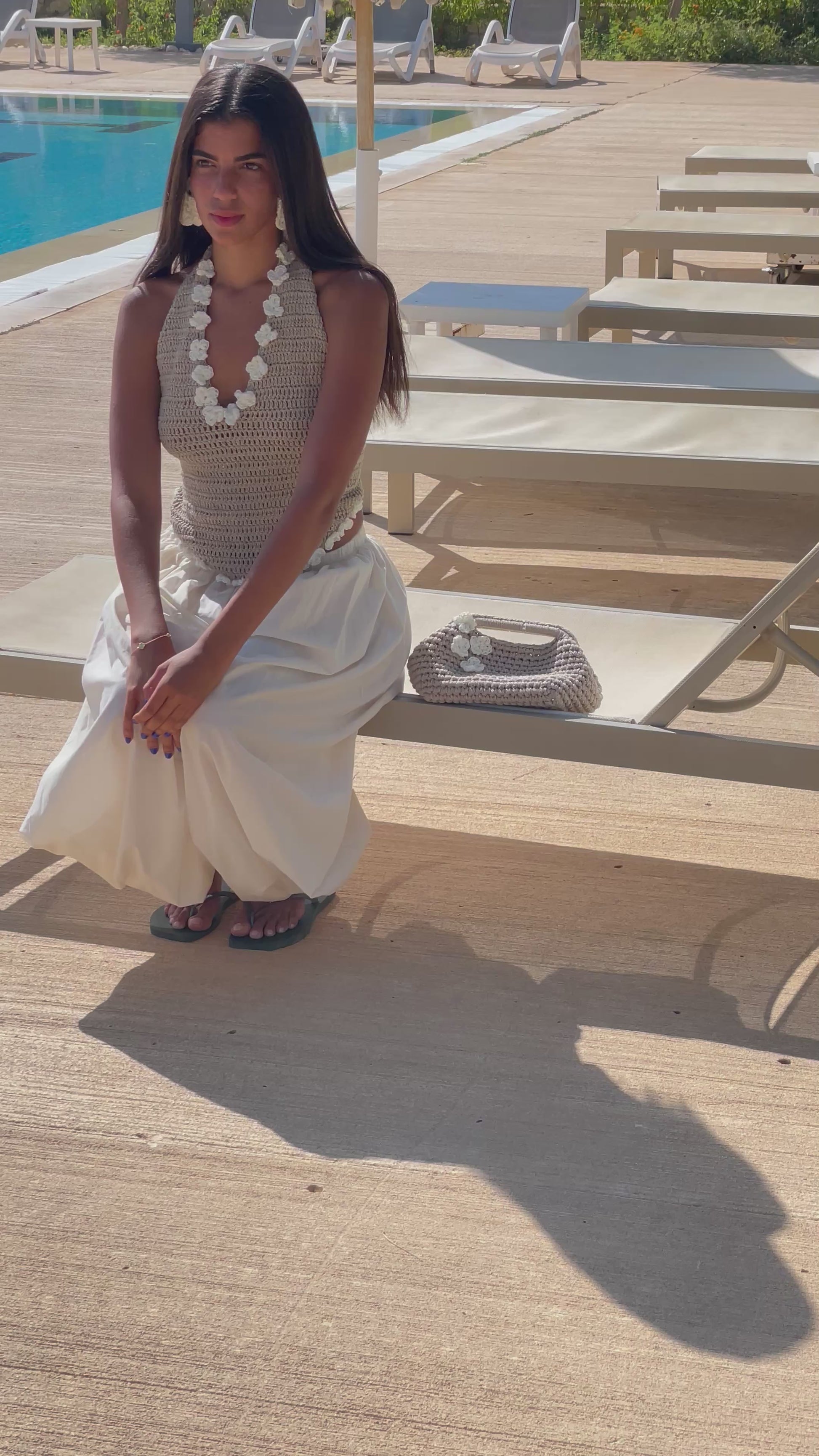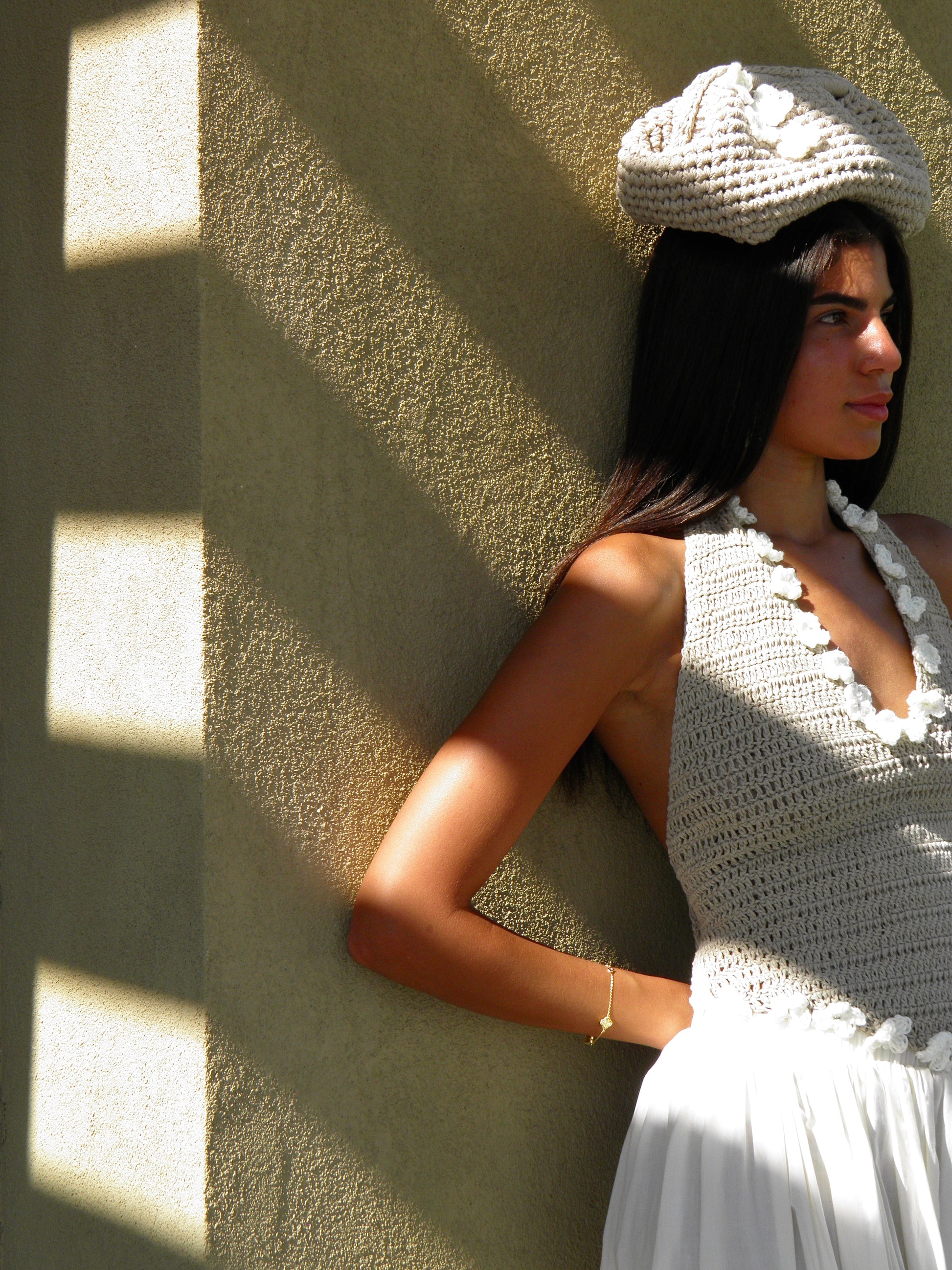 This handmade plunge neckline piece, is beautifully made with Cotton Crochet Threads & adorned with delicate mini 3D Flowers. With a Satin bow from the back, making it easily adjustable for the perfect fit.